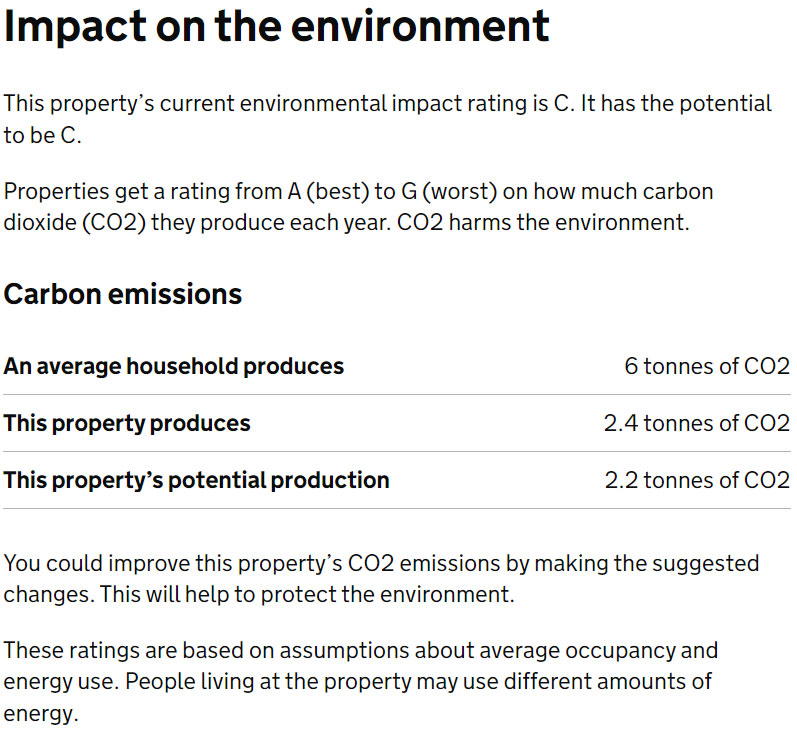The snapshot shows an example taken from an EPC produced in 2023. The carbon emissions are based on the information captured in the EPC assessment, including the size of the property, the type of heating and lighting present and how well the property is insulated.
